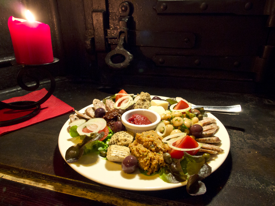 Signalling its pedigree – 550-year-old bakery ovens near the back kitchen attest to that as well as its ongoing reputation as a restaurant under various names since 1897 – limestone stone steps lead steeply down bare-rock walls to the intimate, cavernous dining room below street level (an attractive option in warm weather is the open courtyard in front). Adding a touch of light-heartedness to the restaurant’s weighty historical significance, framed pencil caricatures of politicians, celebrities and other notable guests line one wall. Soothing jazz music plays overhead.