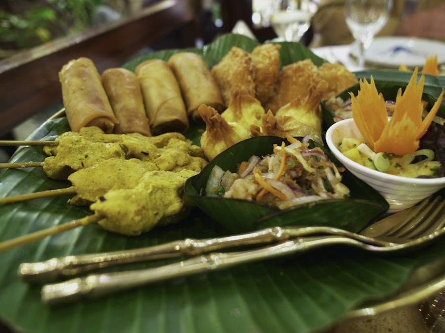 When plates and bowls began to arrive one after another, each trumping the other for sheer delicacy of taste, I felt like Yul Brynner in ‘The King and I’ – strips of grilled marinated chicken served with a cucumber and peanut sauce; minced lamb stuffing with red sweet and sour sauce; crisp golden cakes with prawns and sweet corn; salad of crispy minced tuna fish and prawns with organic lemongrass and ginger; tom yam soup and stuffed egg pastry with Philadelphia cheese.