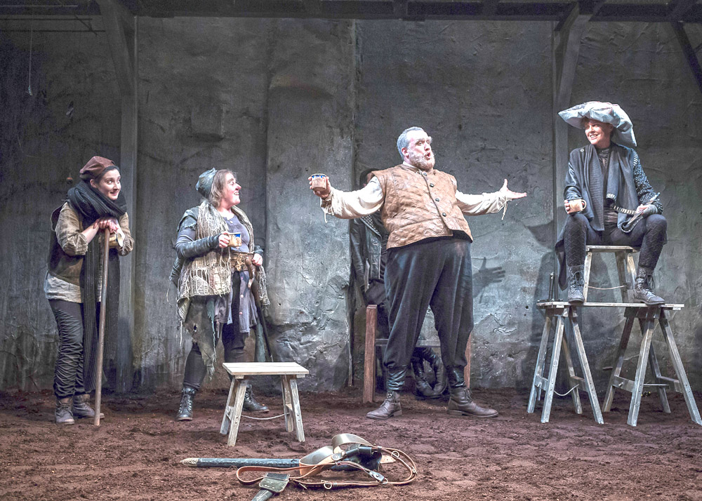Charlotte McCurry (Blunt), Clare Barrett (Bradolph), Rory Noal (Falstaff) and Aisling O’Sullivan (Henry V) in DruidShakespeare photo by Matthew Thompson
