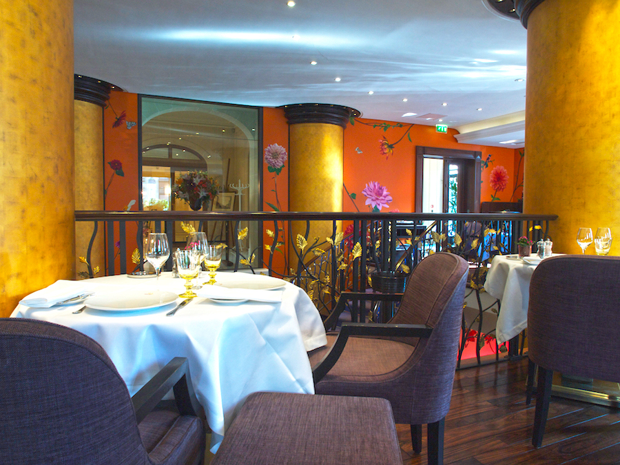 Having paid big bucks to stay at this famed 112 Faubourg address, one should indulge at one of its dining venues. We did, at its single-star Michelin brasserie ‘114 Faubourg’ opened in 2009. And loved it. Located on the ground floor off the main foyer, it features a decorative leitmotif of vibrant, multi-colored dahlia flowers splashed across its orange walls, as well as sandy-colored pillars, with a decorative black and gold wrought-iron and marble balustrade linking its two levels.