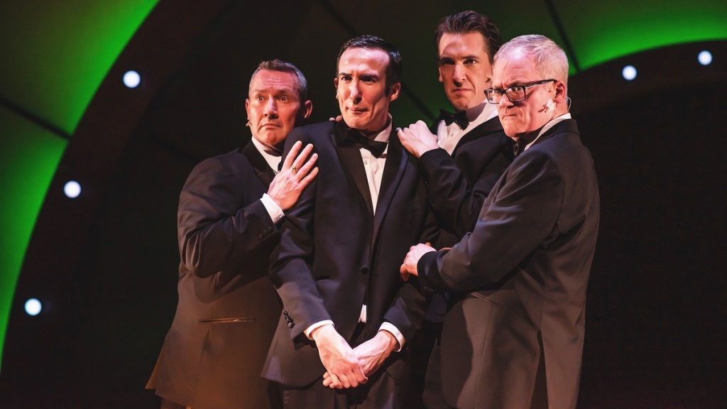 Dressed only in black tuxedos and bow ties, multi-talented actors – Ciaran Nolan, Conor Grimes, Martin Maguire and Chris Robinson – tease and tantalize their audience into fits of uproarious laughter with impressive body expressions and vocal acrobatics that transform them into a host of diverse characters – including solemn, hard-talking nightclub bouncers; bold as brass Sexy Susie and Plain Elaine and Co. preparing for a raucous night on the tiles; and even a disco DJ and some drunken revellers.