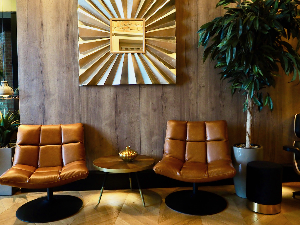 In his search for elegance, Stupariu has also borrowed some ideas, including impressive design mirrors, from leading hotels such as the 5-star Armani in Milan and the Pulitzer in Paris. Our spacious room up a short flight of steps at the end of the first floor featured Chevron style floors, bow windows, varnished wood walls, floor-to-ceiling mirrors, a writing desk and an overall gray and black color scheme. A discreet corner displayed part of the original brick wall.