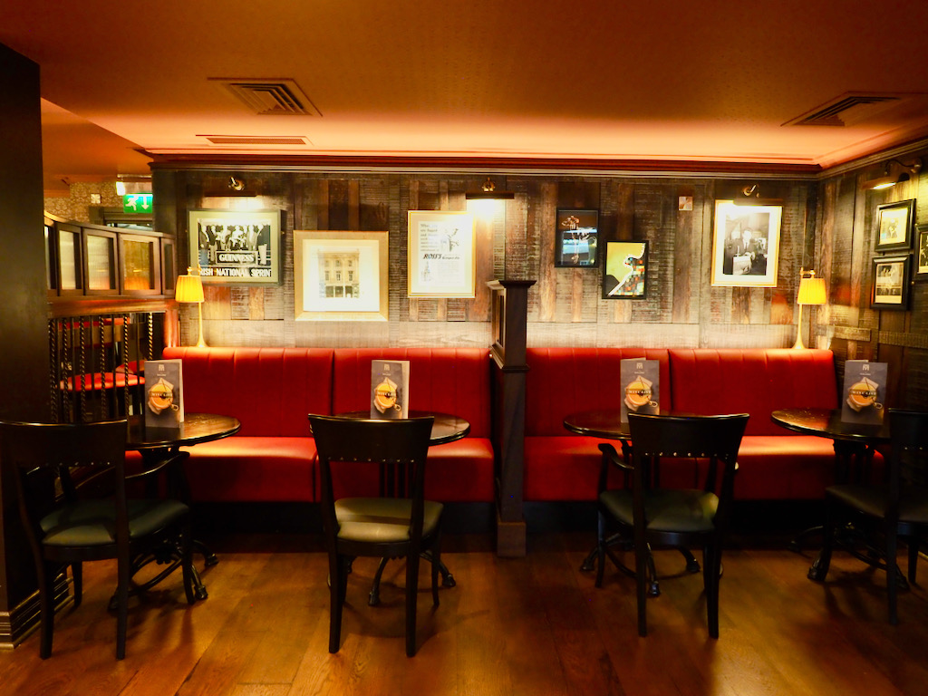 Our room was classically designed, with some chic elements such as decorative ‘bubble glass’ bedside lamp-stands. It had a large flatscreen TV affixed to one wall and a writing desk and chair in a corner of the room. A mahogany-enclosed cupboard and a large stand-alone wardrobe provided more than enough space for our belongings. A brightly-lit, black and white tiled bathroom featured both a separate tub and shower. Toiletries, in innovative packaging created by Bunzl Rafferty Hospitality in Armagh, are branded under the name of Irish-American designer, Paul Costelloe and made in Italy. Their label states, ‘cruelty free, vegan friendly with no parabens.’