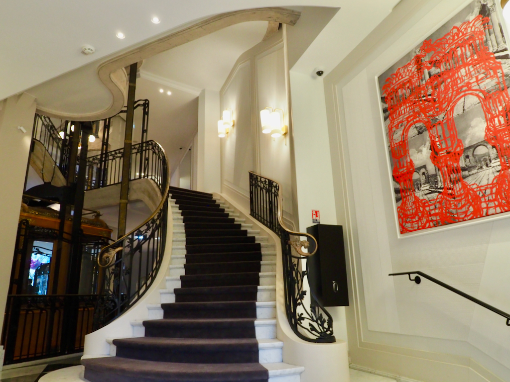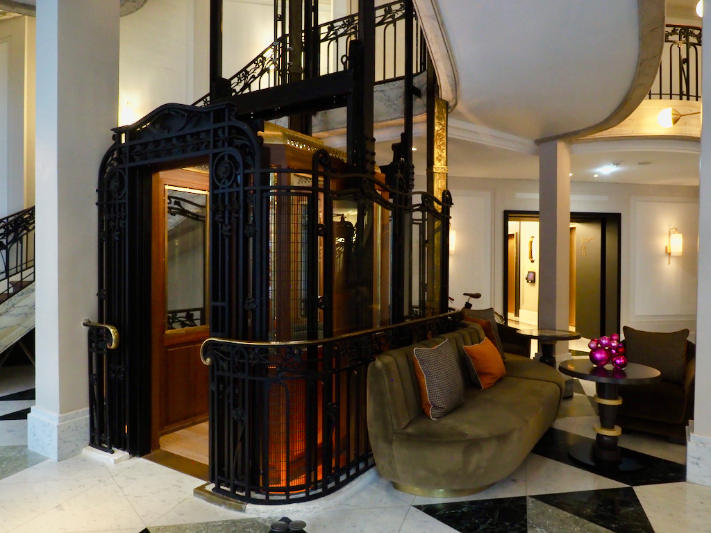 Two vintage wood, brass, iron and mirrored elevators just inside the lobby of the recently-opened 5-star hotel enhance its iconic image even more. Over 100-years old, the elevators are protected by French law, as is its historic façade.