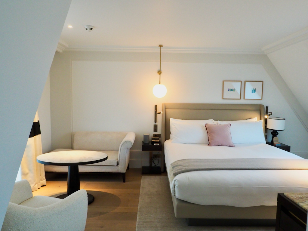 Our top-floor suite, 902, was L-shaped with a long corridor, the bathroom half-way along featuring bath, step-in shower and double sink, all clad in Carrare marble, and a spacious bedroom at the end. Large slanted windows granted an abundance of natural light and fine views across the city. Including the Eiffel Tower.