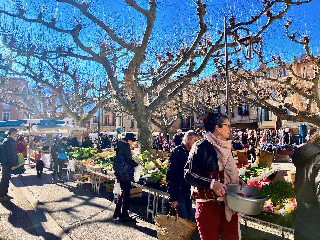 Market-day stalls fill Prades central square and streets beyond.