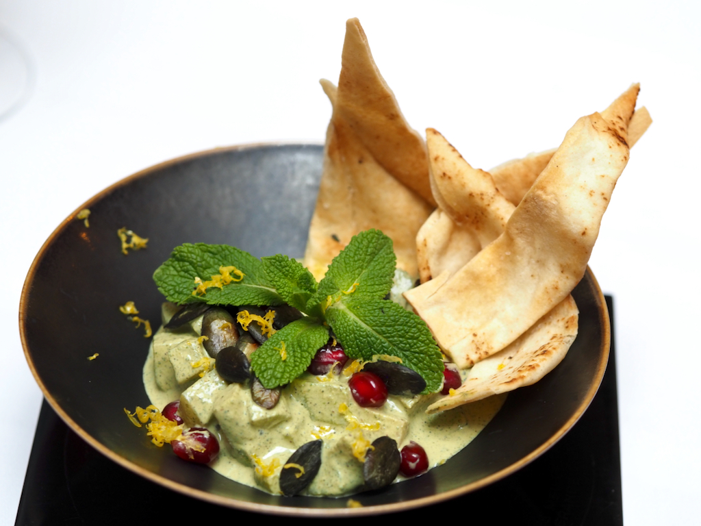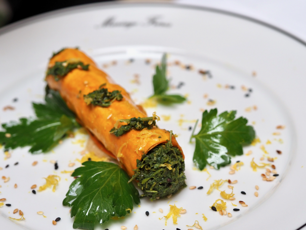 They included tzatziki with Casablanca tea and fresh mint, pumpkin seeds, lemon grind and pomegranate; cannolo with hummus and green beans, with young, tender green tea leaves from Japan; Snob salad of green beans, bulgur, tomatoes, mixed greens, artichoke, prawns, house-smoked salmon, home-made foie gras and a salad dressing with Marco Polo vinaigrette; prawns with roasted peanuts, celery, carrots, mushrooms and a juzu Japonese tea bisque.