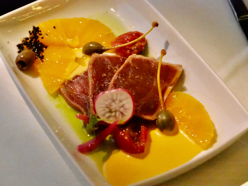 Sicilian-born executive chef Massimo Tringali created a stream of dishes to whet our appetites, starting with sarda bread from Sardinia, generous chunks of parmesan and pizza shaped like a doughnut with olive and tomato. A healthy salad followed featuring corn, broccoli, artichoke, cherries and white artichoke with balsamic vinegar and a smooth pea sauce. Then came a plate of the traditional Piedmont dish, vitello tonnato, cold sliced veal covered with a creamy, mayonnaise-like sauce flavored with tuna.