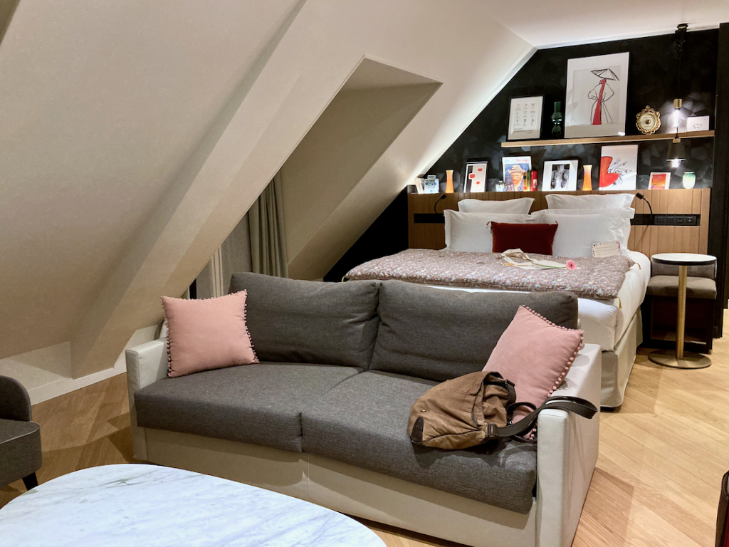 Our spacious room, 601, known as the Rein Mère (the Queen Mother Suite), offered views from two separate balconies across assorted Parisian rooftops. Art was abundant but not overwhelming and included framed black and white photos and pencil sketches. There were even some books for reading pleasure and an in-room tablet loaded with a local city guide and other information. On a shelf above our ample-sized bed were delicate orange vases.