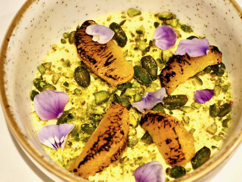 We enjoyed lunch here one day, I starting with what was entitled ‘perfect egg,’ a blend of egg with mushrooms and red pickle onion and my companion savoring the homemade pork terrine with purple cauliflower pickle. For mains, I chose sea bass with cauliflower, my companion opting for chicken supreme with sautéed wheat, broccolini and chipotle. Desserts were equally tasty, mine being chocolate granache with thin apple slices decorated with pansies, and my companion enjoying orange and pistachio panna cotta.