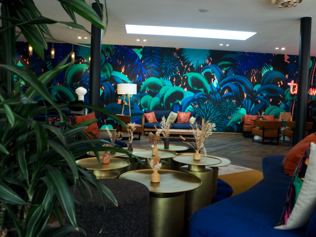 An assortment of seating featuring soft fountain-ink sofas and cane armchairs positioned among potted plants stand beside the open-plan ‘Gina Coffeeshop’ with gold-colored tables with dried plants in vases on them.