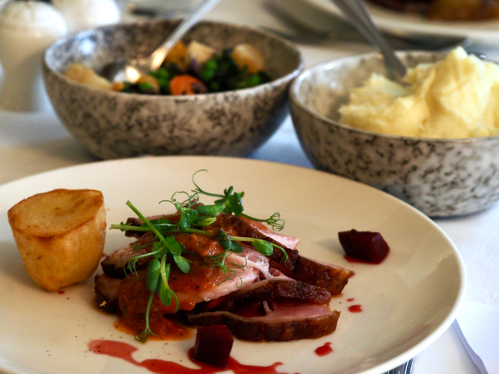 A hint of spiciness added to my companion’s enjoyment of her slow roast bacon loin with beetroot and salsa. Our lunch came with side dishes of creamy mashed potatoes and a bowl of mixed vegetables including turnips, carrots and baby kale.