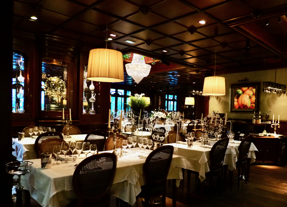 The ‘Doré Room,’ for example, is decorated in gold leaf with crystal chandeliers. Art deco sculptures by Max Le Verrier, light fittings made from metal cutlery, vintage silver and bronze serving dishes, paintings, baroque embellishments, a chocolate fountain as well lush plants, mahogany woodwork and gleaming brass fixtures adorn the other rooms.