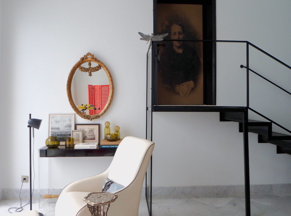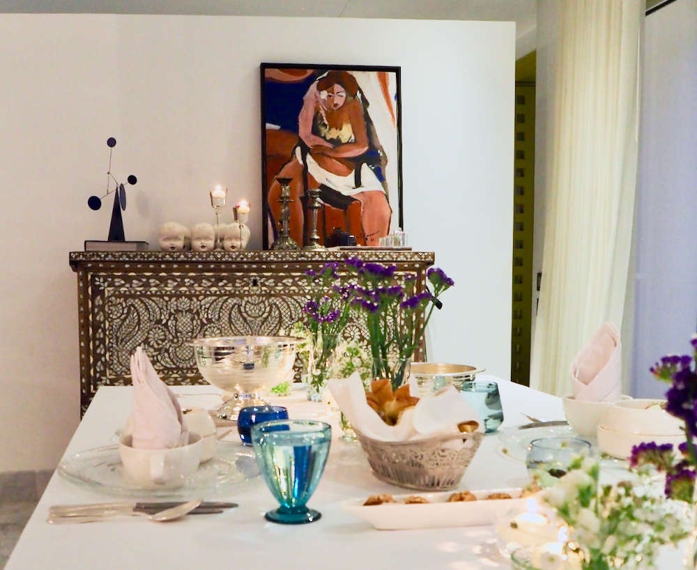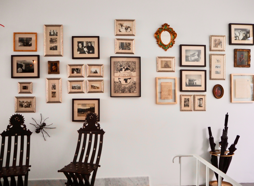 Overall, the spacious interior of Maison Dedine is bright and uplifting with a diverse range of furnishings. Large-scale contemporary paintings and black and white photographs by Sabri ben Mlouka adorn the walls with a host of decorative artefacts such as traditional wooden cabinets featuring mother-of-pearl marquetry, giant ceramic prayer beads hanging from a wall and fantasy sculptures of what look like comical ant-eaters in a spicy mix of colors perched on long thin pedestals by local artist Rym Karoui. A collection of about thirty framed black and white photographs on one wall pays tribute to the owner’s extended family dating back several generations.