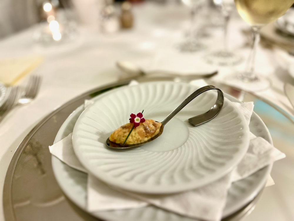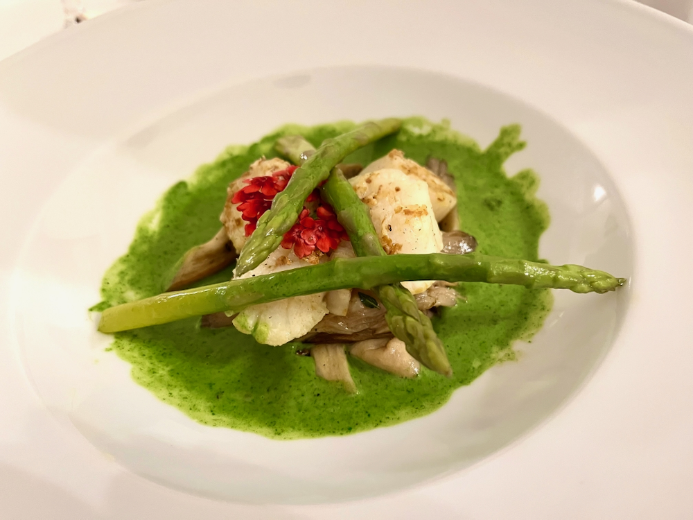 Here with portraits of family members adorning the walls, our gourmet evening began with two starters, one being crab and shrimp duet with avocado and the other sautéed scallops with pleurotus mushrooms and green asparagus, all decorated with cosmos and verbena petals.