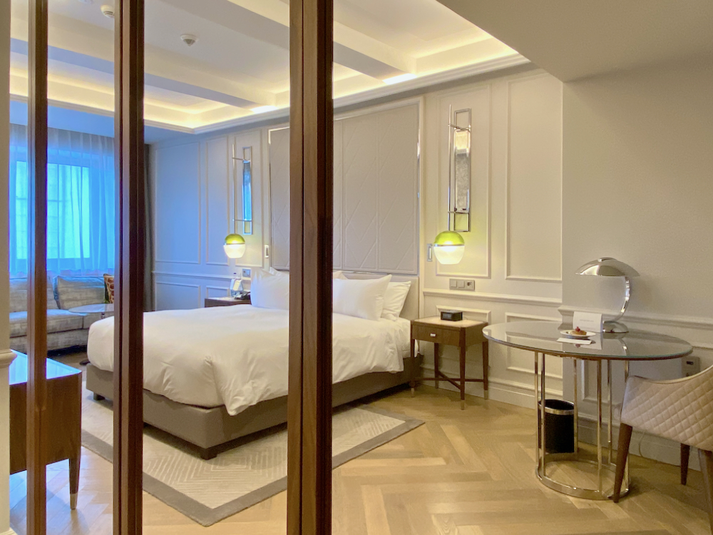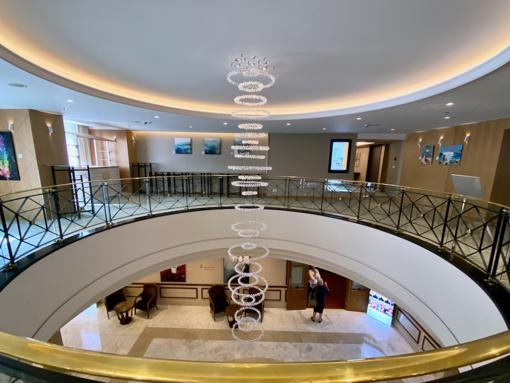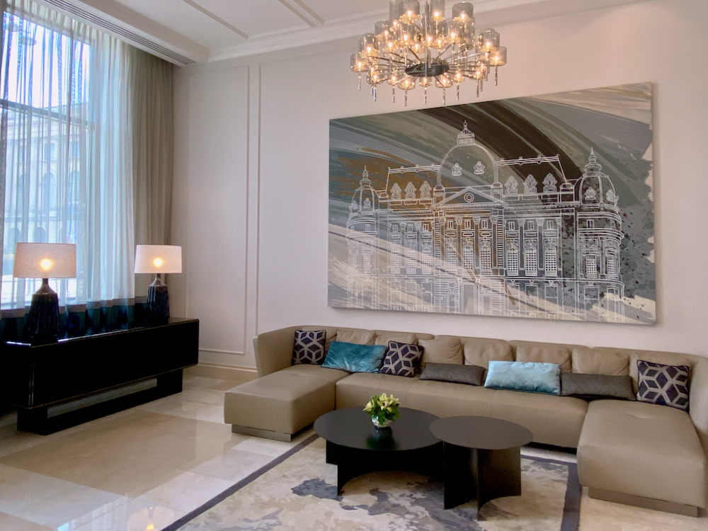 A spacious lobby with soft comfortable couches either side, vases filled with fresh flowers, exotic plants in pots and speckled marble replica Corinthian pillars greeted me as I entered through the revolving entrance doors. A central chandelier with a majestic art deco motif of metallic and glass leaves and flowers hangs high above.