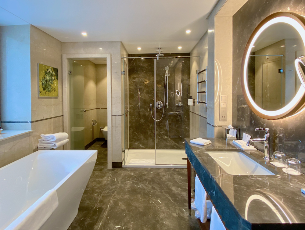 A nod to the hotel’s illustrious history, a portrait of Alexandru Vaida-Voevod, a long-serving Romanian Prime Minister, hung on the wall. Our tiled bathroom comprised both a large bath-tub, glass-fronted shower and a marble wash-hand basin. Toiletries were the Byredo Bal d’Afrique brand.