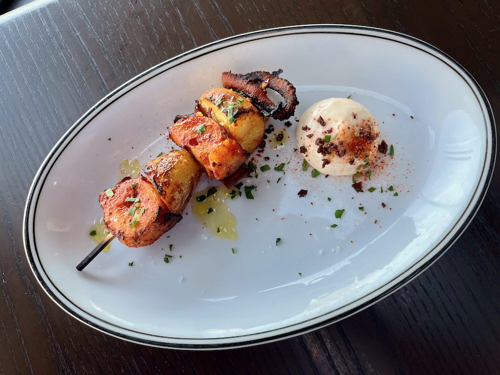 Preferring seafood, I opted for marinated octopus as my next course, caught near Kaikoura, a coastal town in South Island. To my mind, this denizen of the deep is delicious naked, but it was even tastier cooked as it was on a skewer over coals with fino, dry white sherry and paprika, accompanied by potatoes and aioli.