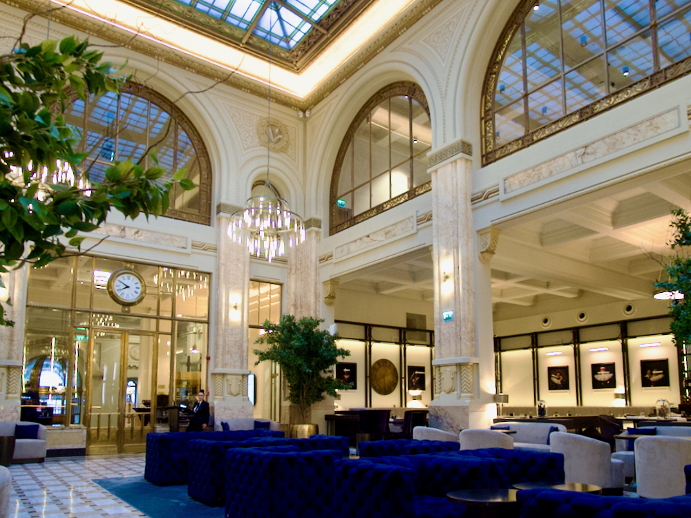 Nostalgia for a golden past is obvious even before entering the Marmorosch, with a vintage Cadillac parked outside as a symbol of opulence. Inside, a wide marble staircase leads guests to side-by-side reception desks beyond which is an eye-popping architectural vista – a vast atrium flooded with natural light from an ornate, stained glass ceiling high above, with a gleaming checkered marble floor, tall, sandy-colored Corinthian-style pillars and four massive hanging chandeliers.