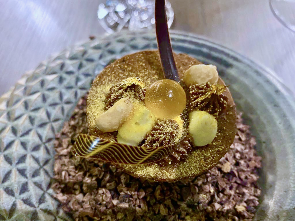 Chef Octávio’s respect for naturally-grown Madeiran produce (he grows organic vegetables and produces his own wine on his land) continued in my companion’s choice of dessert, reconstructed Madeira cake, a light pastry choux with a custard of island cane honey inside and dried fruit and nuts, all under a mini-mountain top of cacao nibbles. My choice comprised a combo of pineapple and banana slices swimming in cane honey, surprisingly spiced by a slight dose of pepper sauce.