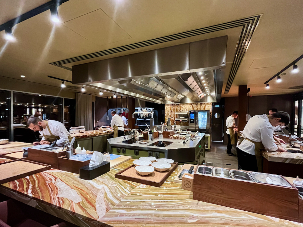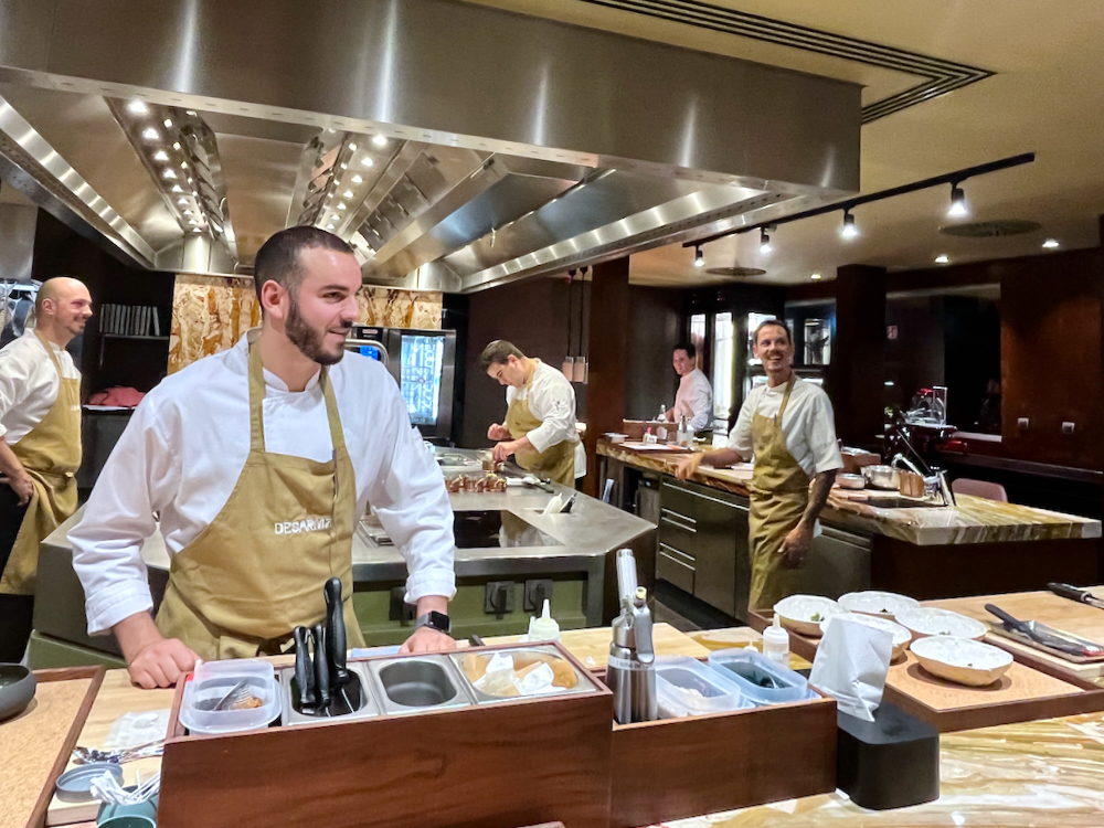 My first impression as the doors slid open was of a spacious room with a big open kitchen where a team of chefs dressed in white coats and caramel-colored aprons were hard at work as if in a laboratory concocting new flavors, while outside, through a floor-to-ceiling windows, the lights of Funchal twinkled in velvet darkness.