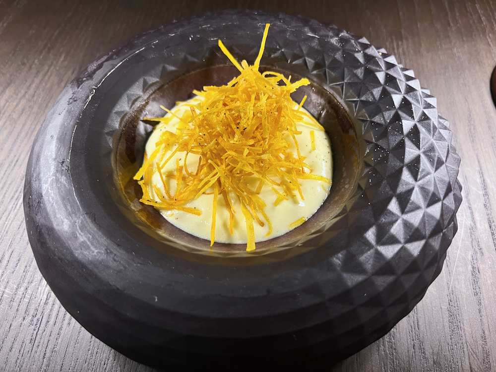 Our first course, presented in a black ceramic bowl resembling delicately carved prehistoric pottery, was a creamy blend of sweet potato, truffles and dashi topped off with hay-like flakes of sweet potato.