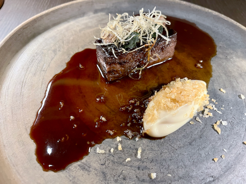 Espetada de atum, or spit grilled tuna followed on a flat bronze plate with bay leaf and roasted garlic cooked slowly over hot coals, the texture of the tuna as soft as tartare, melting cleanly in our mouths. Next up was a crumbly, cookie-like combo of dry limpets with aged beef tartare and mushroom gel shaped like a mini-burger.