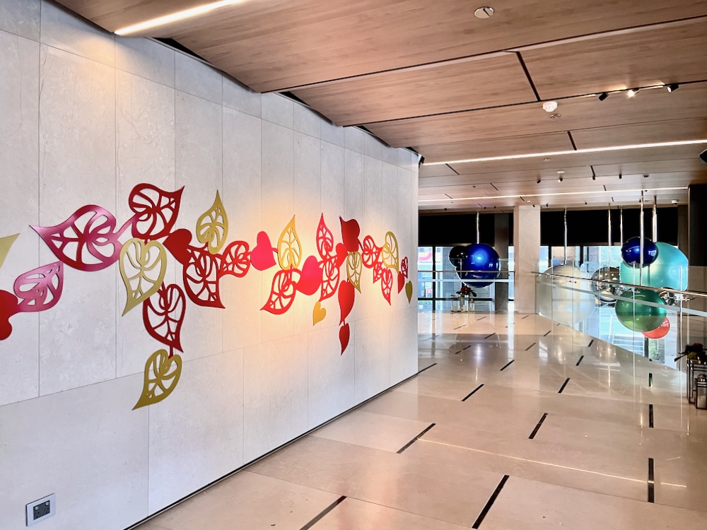 The reception area also features 21 large panels entitled Ki Mua, Ki Muri which highlight the ancient art of tukutuku (weaving), a collaboration between Beronia Scott and Carla Ruka with Te Pūawai Ōrākei Marae.