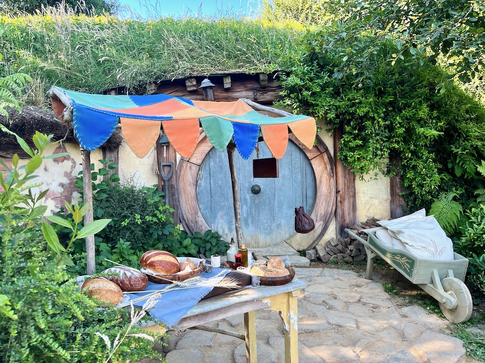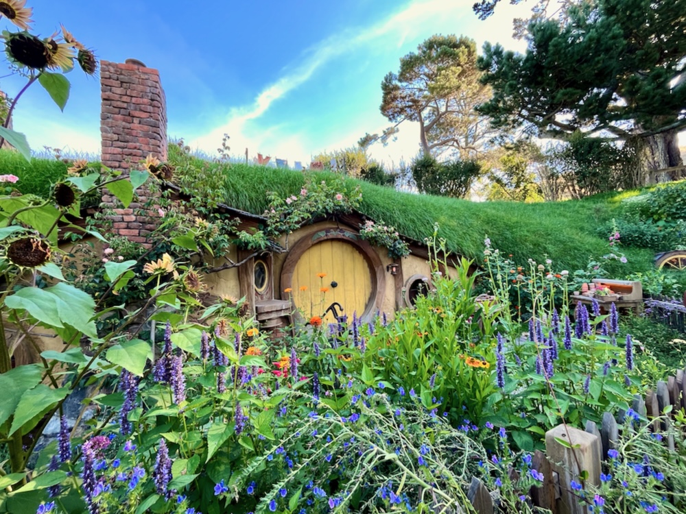 For over an hour, we meandered with him along narrow pathways criss-crossing rolling knolls dotted with rotund, earth-mound hobbit houses with their colorful arched doorways, including Bag End, home of Bilbo and Frodo Baggins, until we reached the highlight of our trip – recently-furnished hobbit homes at Bagshot Row that you can actually enter.