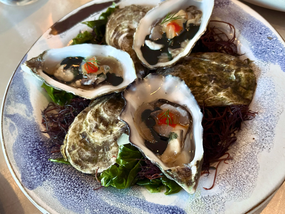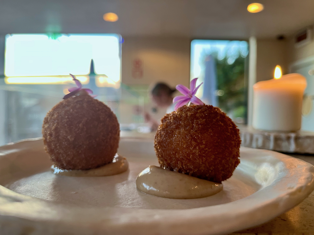 Our feast began in earnest with oysters laced with seaweed oil, pickled cucumber, with a drop of homemade piri piri sauce and a feather of dill from their own impressive organic garden at the rear of the restaurant. Lamb croquettes followed, bonbons of the shredded meat with fermented garlic, fried in breadcrumbs, accompanied by lemon mayo.