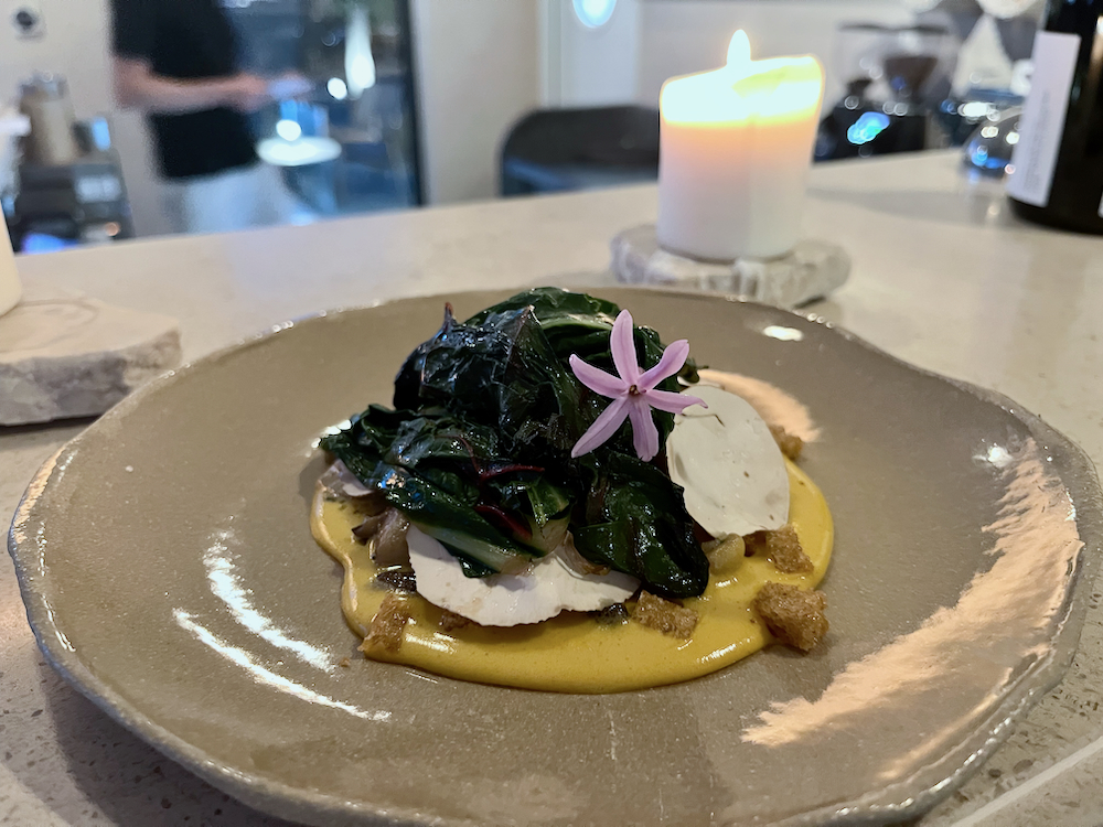 My companion, a medical herbalist and lover of mushrooms not just for their taste but for their health benefits, loaded as they are with vitamins, minerals, and antioxidants, was delighted with the next course. An assortment of the celebrated fungi including shimeji, plurox and brown button, wild foraged, appeared at our table with leaves of chard, hollandaise sauce and croutons of sourdough bread that granted a crunchiness to the soft vegetables.