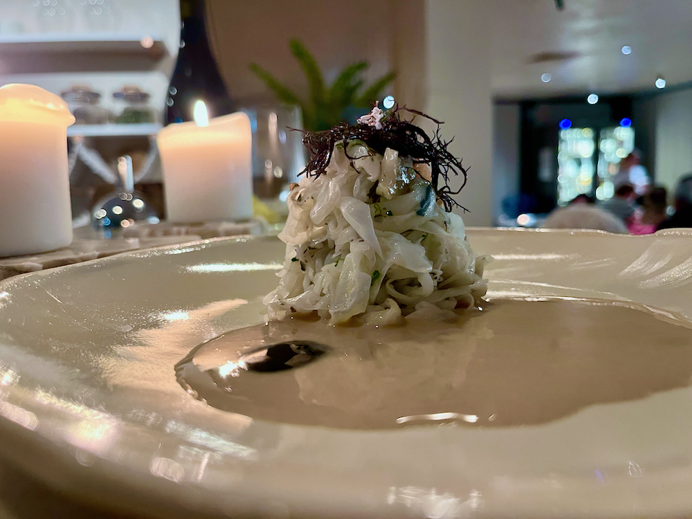 Up next was smoked cuttlefish, cut thin linguini-like with seaweed oil, which according to my poetic companion, “sends you to the bottom of the sea where earth meets water.”
