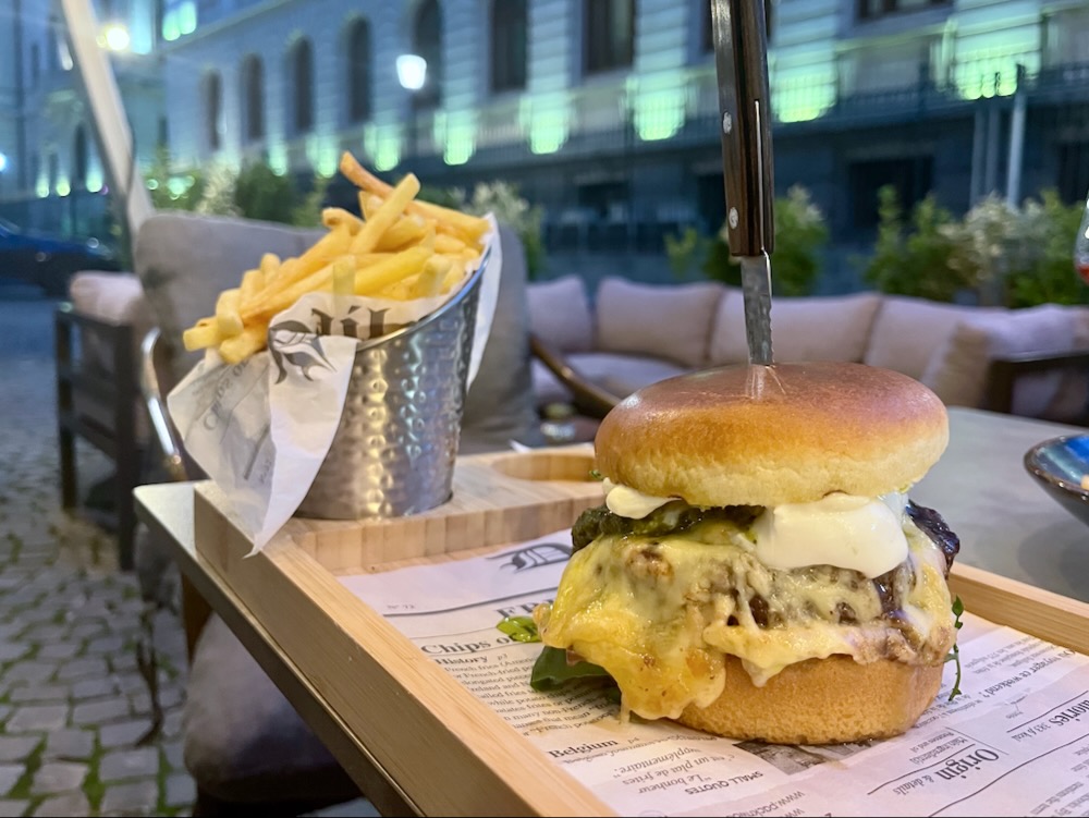 The aroma of sizzling meat from a nearby table was too much for my hungry companion who opted for the rib eye which came as a generous cut presented on a thick iron griddle and sliced carefully table-side, accompanied by three different sauces. My choice was hamburger, tastefully combined with melted burrata, basil pesto, spinach and garlic.