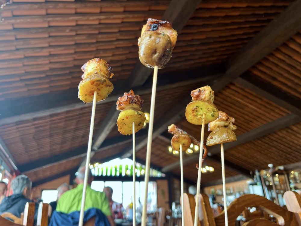 The name of my starter, lollipops of saffron-flavored octopus, was simply too intriguing to miss. And it didn’t fail to surprise, arriving skewered with potato slices on thin sticks inserted in a long curved wooden board, ten small cuts of the sea creature, the meat soft and tender, with a traditional mojo dipping bowl of parsley, paprika, garlic, wine vinegar and green pepper.