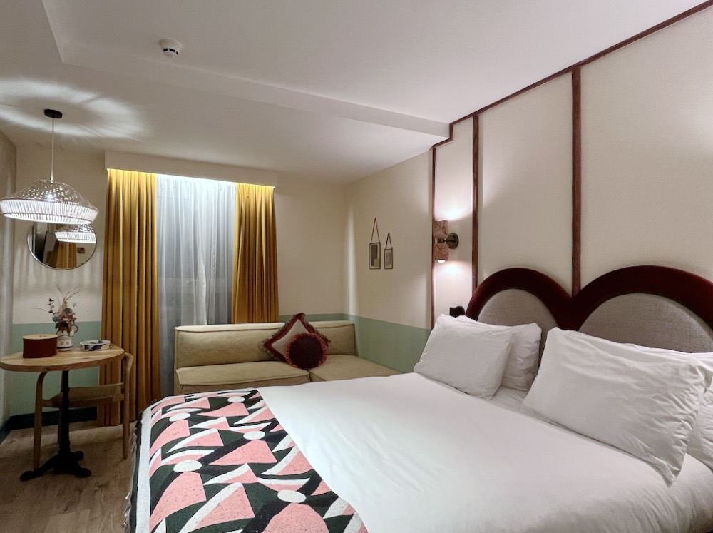 The lobby of room2 is colorful and decorative, with a simple yet inviting reception-cum-welcome desk, beside which is a generous complimentary display of fruits including apples, plums and oranges for guests, with water flavored with orange and cucumber slices as refreshing drinks. Behind the reception desk are shelves of snacks from potato crisps to salted caramel popcorn and peanuts, as well as drinks of all kinds, for purchase. One the other side is an open bar with comfy, cushioned barstools and beyond that Winnie’s, a two-sided cafe filled with chairs and tables where live music was being performed and where breakfast is served buffet-style, though guests can also order specific dishes.