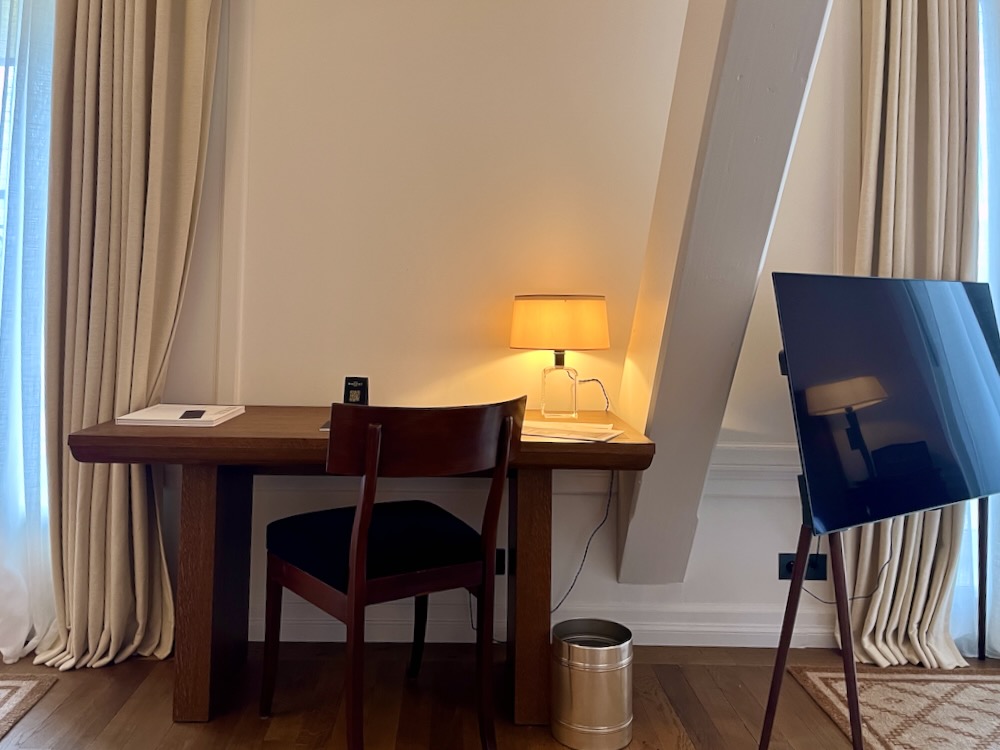Marble featured lavishly in my bathroom, speckled grey on the walls with beige-colored floor tiles, with a double sink, bathtub and spacious walk-in shower. Toiletries were the Diptyque brand, located on Boulevard Saint Germain. There’s even an impressive weighing machine for those bold enough to check.