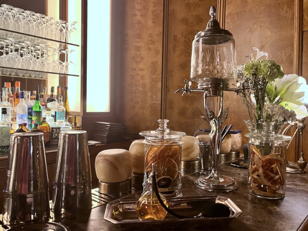 Being a bartender in my younger days in Ireland, I was curious to see close-up how well-stocked the bar was. I was not disappointed. It housed an impressive collection of natural (note the word ‘natural’ not synthetic) flavorings including Thai and Japanese bitters and others in shapely bottles as if from a laboratory. There was even a special spray for added zest. Fresh flowers including lilies decorated the bar-top with an ornate lamp, described by Saona, a friendly staff member conceived on the Caribbean island of the same name, as having being made in Italy and featuring a lighted fire of freedom.