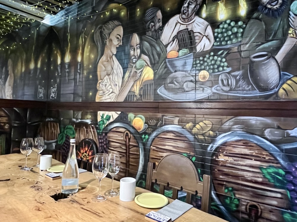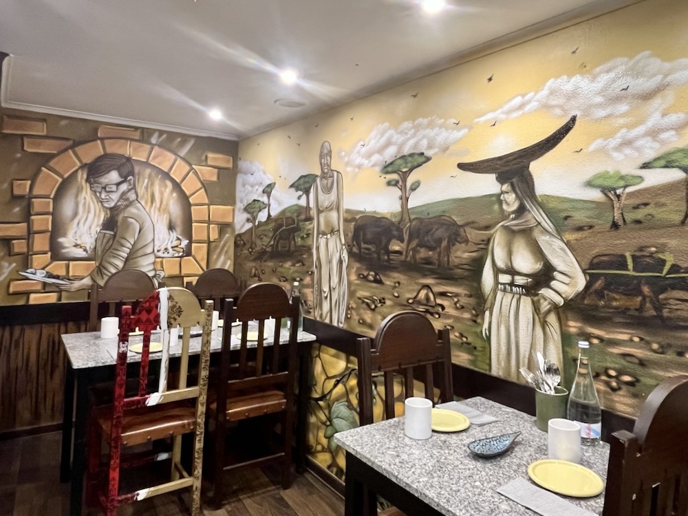 Adding charm to the occasion, the chairs my companion and I sat on were designed by staff members, with ones painted with the letters RIP and LIP (‘Dine in Peace’ and ‘Lunch in Peace’). Colorful wall murals surrounded us, the work of Eky One, a talented Porto artist.