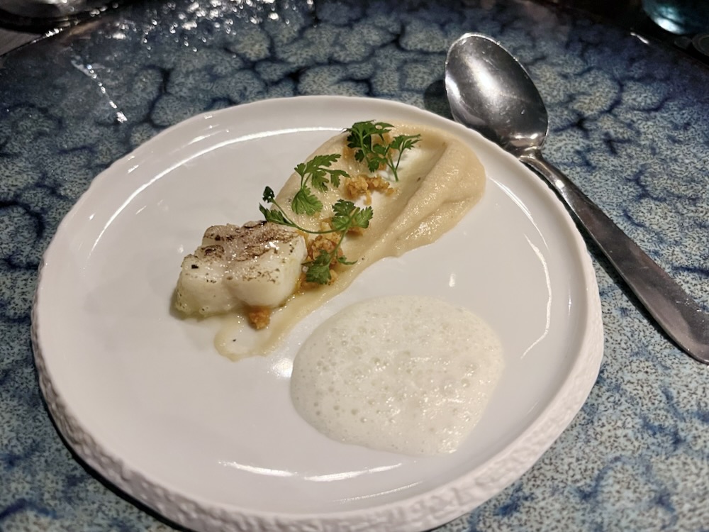 Our young servers, Elias and Flavie, translated dishes from French to English for us Anglophiles starting with our first course, an amuse bouche of white fish, turnip puree and herb foam.