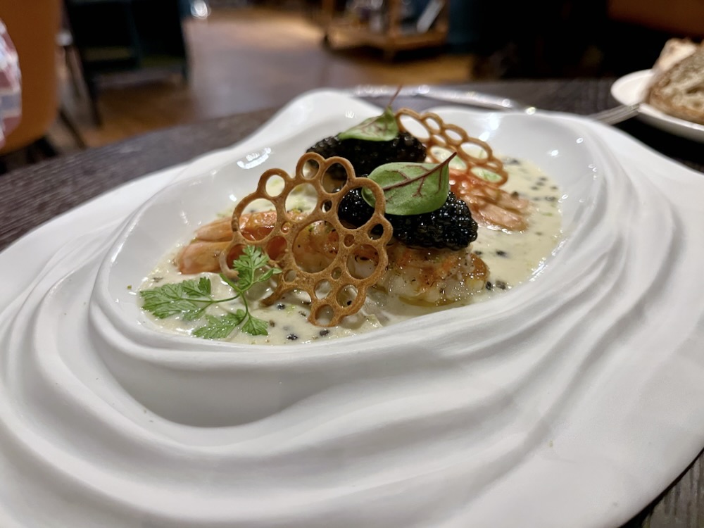 I chose the chef’s signature starter, flame-seared langoustines with a Charentaise chowder Royale, an umami soup made from rock fish and shellfish garnished with vegetables and herbs, flavored with lemon condiment and dehydrated caviar grains.