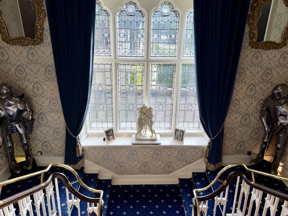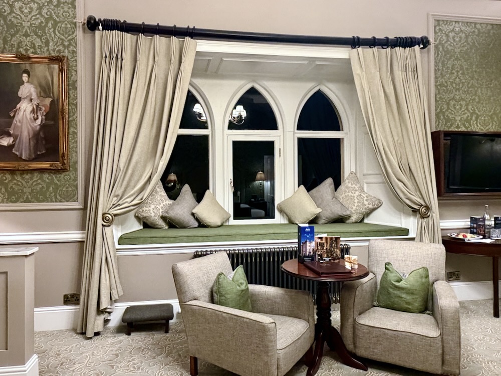 My companion and I stayed in a premier suite, designated number 24, in the main castle building, overlooking the entrance doorway and the forest. Reached up several flights of carpeted stairs, the suite comprised three separate rooms with a hallway between.