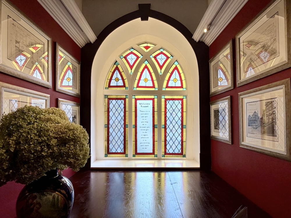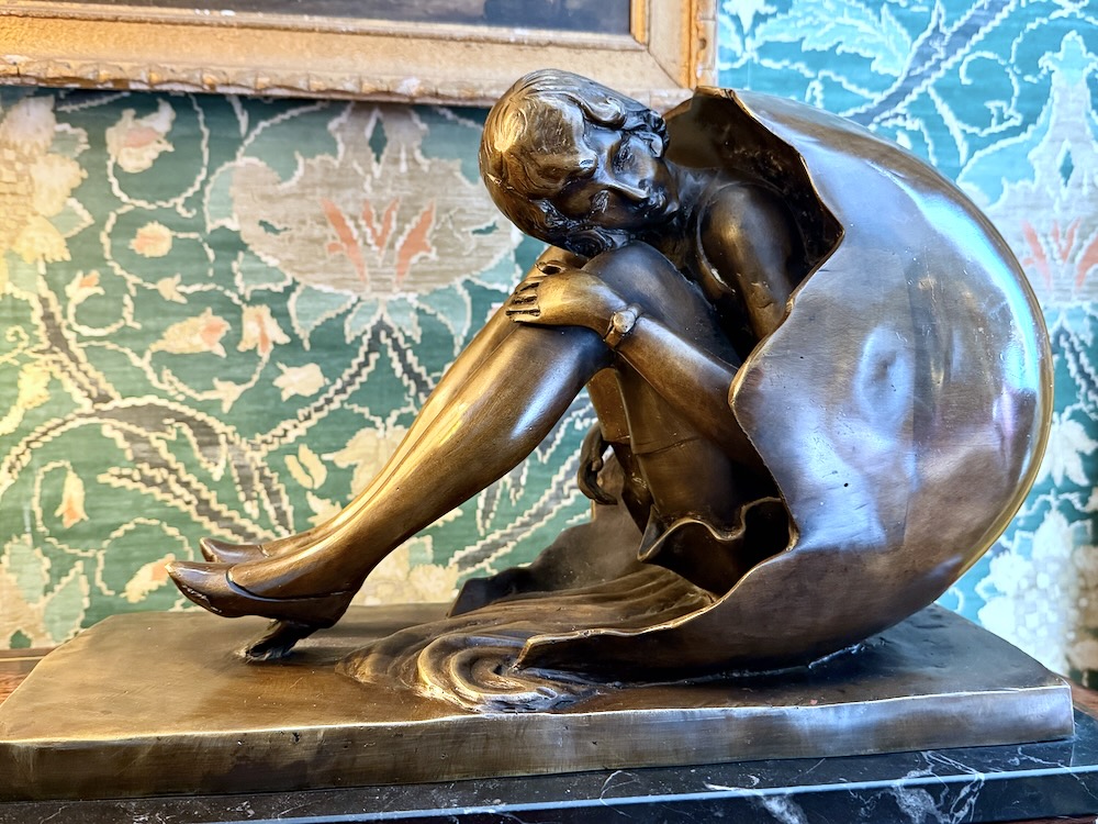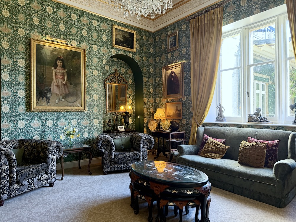 The Residents Room opposite the Gold Room – with a giant metallic chandelier hanging over a stairway between them – features cosy armchairs with floral motifs and an equal abundance of framed paintings, both portraits and landscapes. Ornaments on walnut tables include urn-shaped lamp stands, a chessboard, bronze statuettes, including an evocative one of a young child emerging from a half-open egg, as well as a reindeer, a wolfhound and figurines in medieval garb.