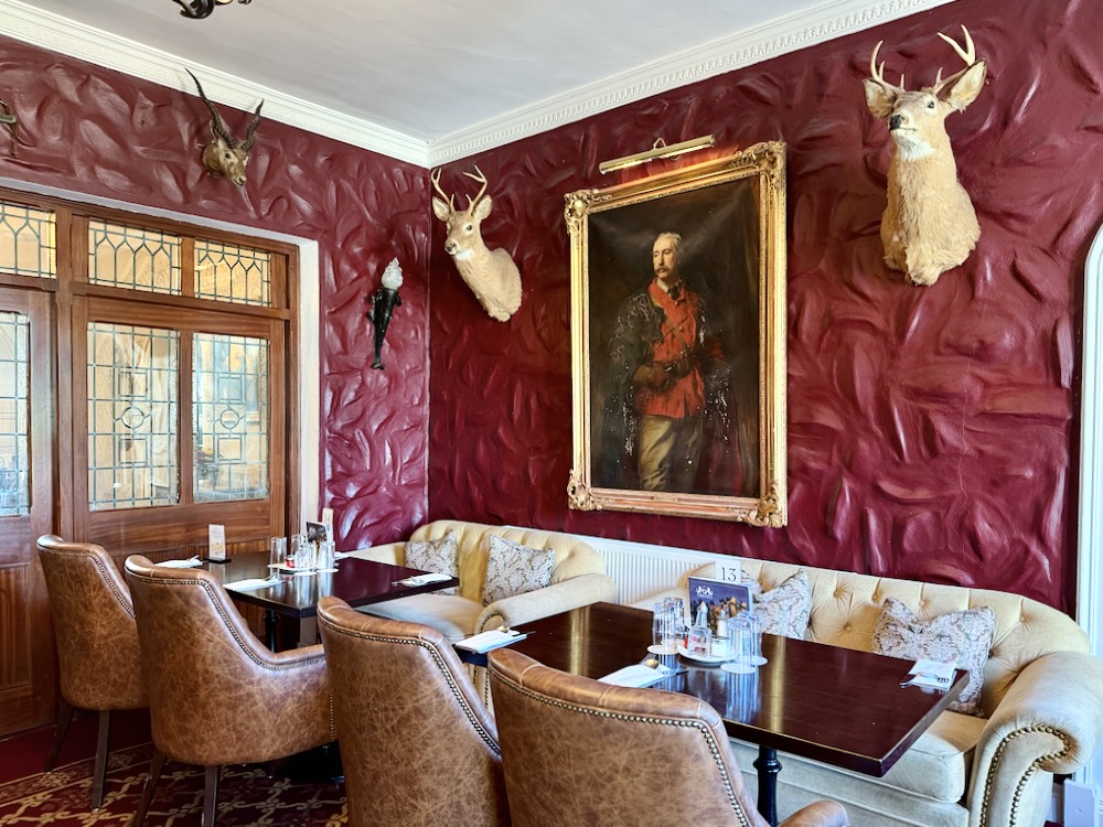 Our bedroom at the end of the hallway was spacious, as was our king-size bed. Featuring a deep carpet and high ceiling, its classic furnishings included a tall wardrobe, a coffee table with twin armchairs, a writing desk beneath a wall TV and a free-standing oblong bathtub above which hung a gold-leaf mirror. Curled up cosily, book in hand, my companion really enjoyed the window reading nook overlooking the forest.
