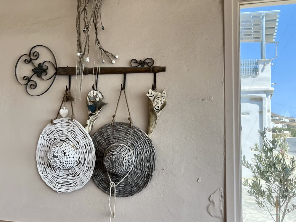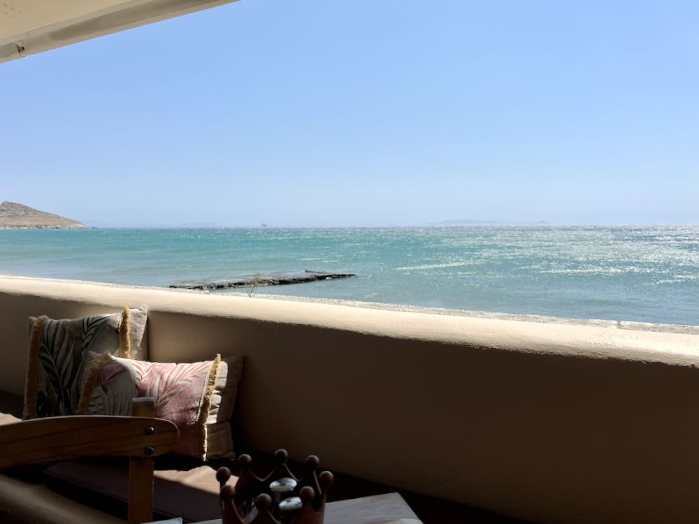 Reflecting a marine theme, overhead lampshades are shaped like sea urchins and decorative octopi are created from entwined ropes hanging from the walls. Being so close to the Aegean Sea with an outcrop of partially submerged rocks facing us and the islands of Delos and Mykonos on the horizon, my companion was inspired to say “so close, the breeze adds salts to your food.”