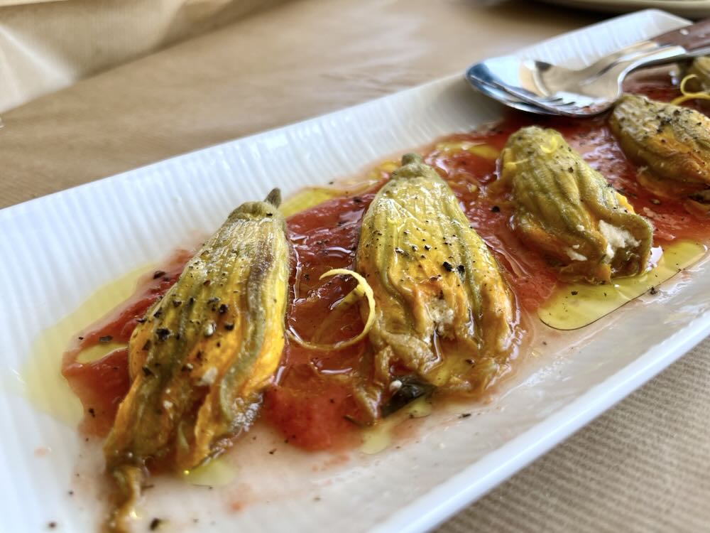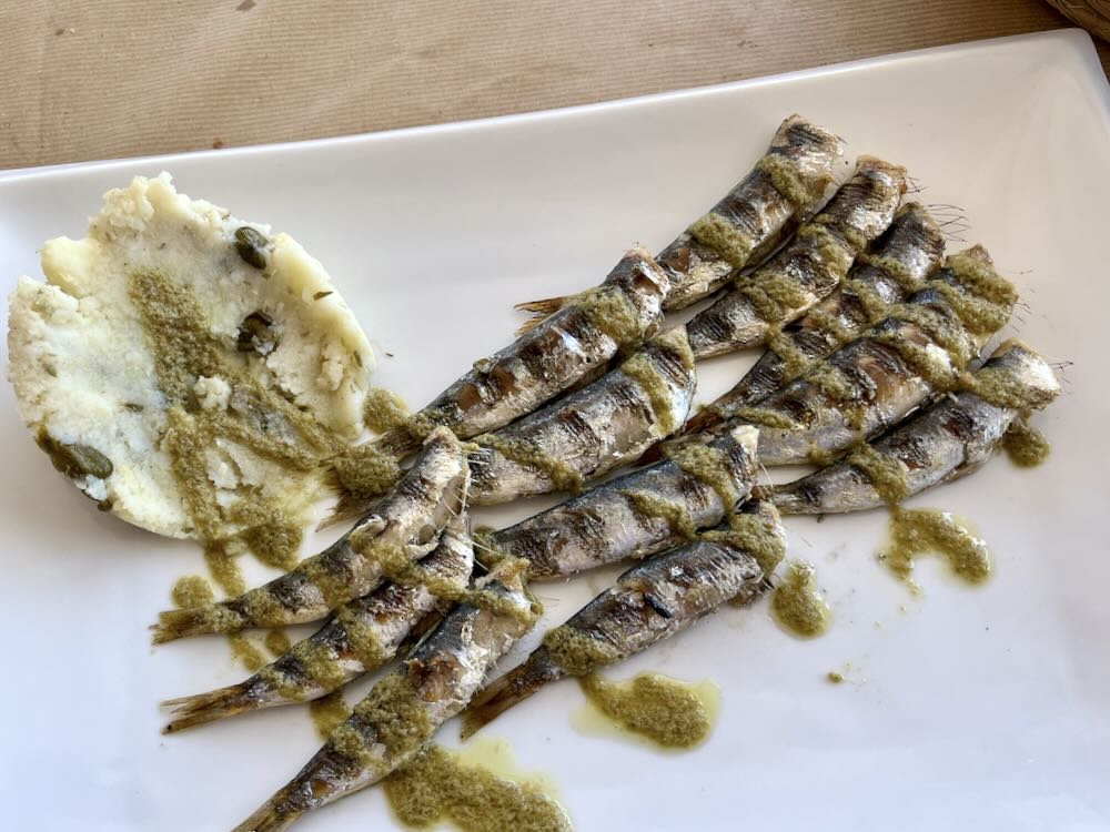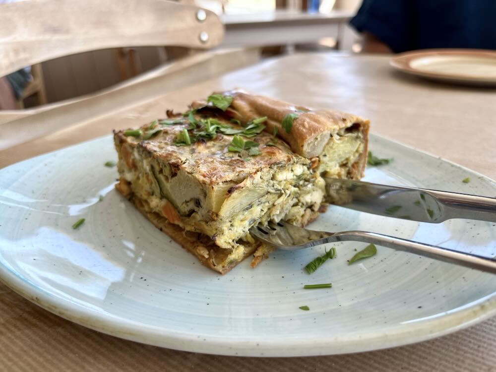 While primarily a seafood menu, there is also an impressive mezze of vegetable dishes. My companion and I decided on starters of traditional island delights, soft zucchini flowers and a generous portion of artichoke pie. For mains, we chose octopus on the grill and sardines tenderly cooked with a mix of potatoes, almonds, capers, oil and vinegar.