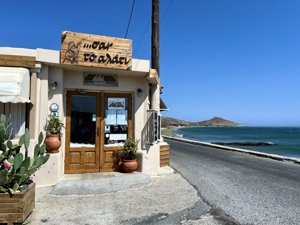 Interestingly, this restaurant located right next to the beach of Agios Fokas and close to the harbor town of Chora, also sells a variety of souvenirs including hats, T-shirts, tumblers, mugs, bags and puzzles, all linked to the popular fairy tale.